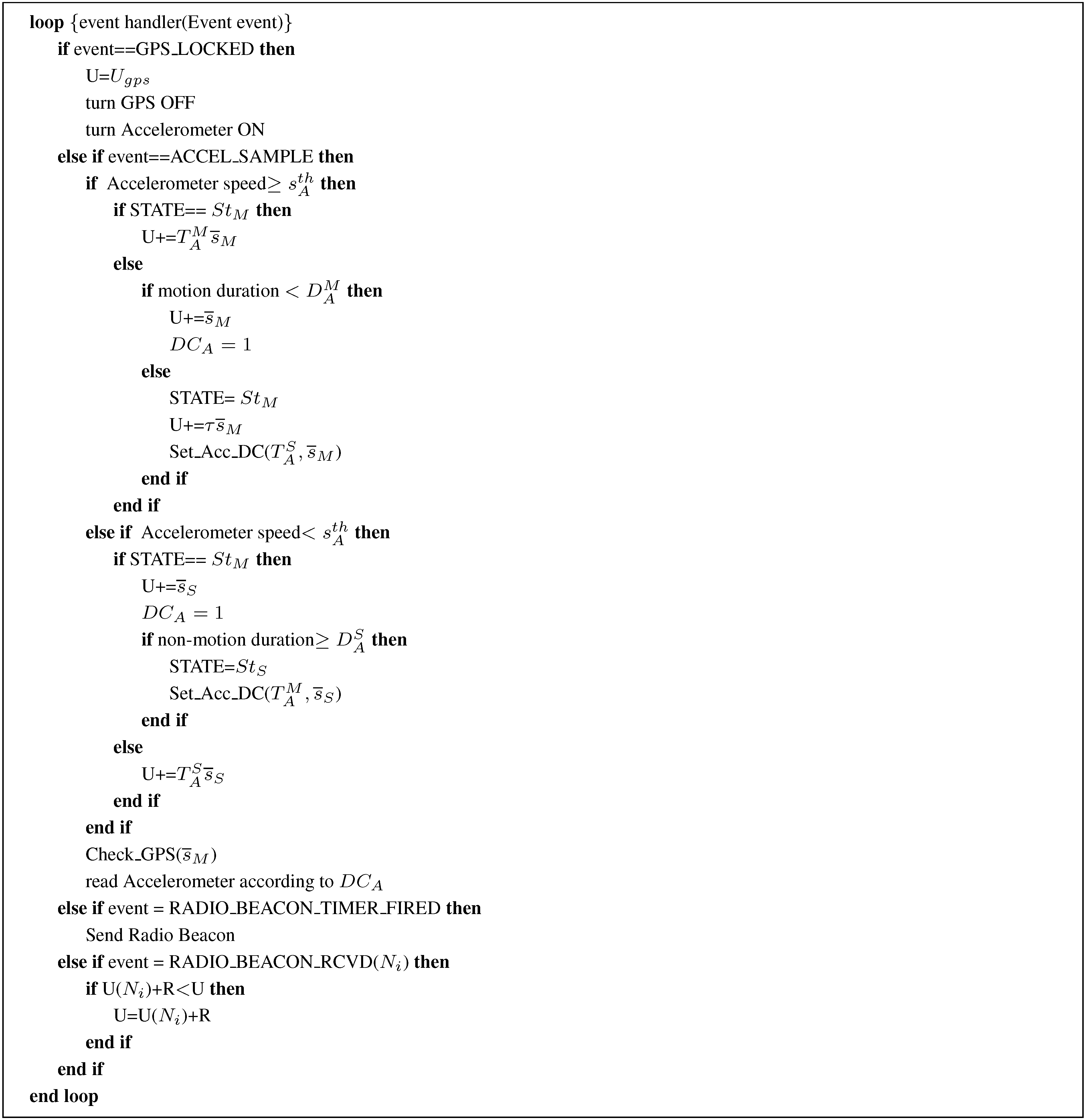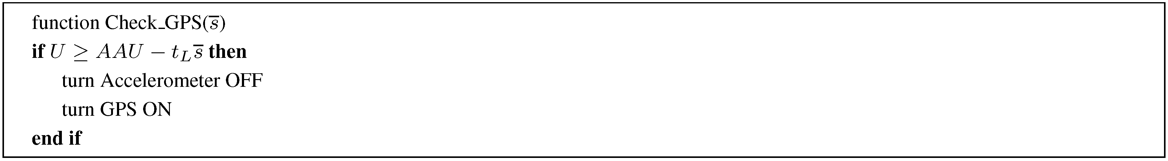 as long as motion continues and increases uncertainty accordingly. Every time instant that it increases its uncertainty, the node checks whether the uncertainty has reached a critical threshold by calling the Check_GPS() function (see Figure 4). If so, the node activates its GPS module to start the GPS lock process and powers off its accelerometer.