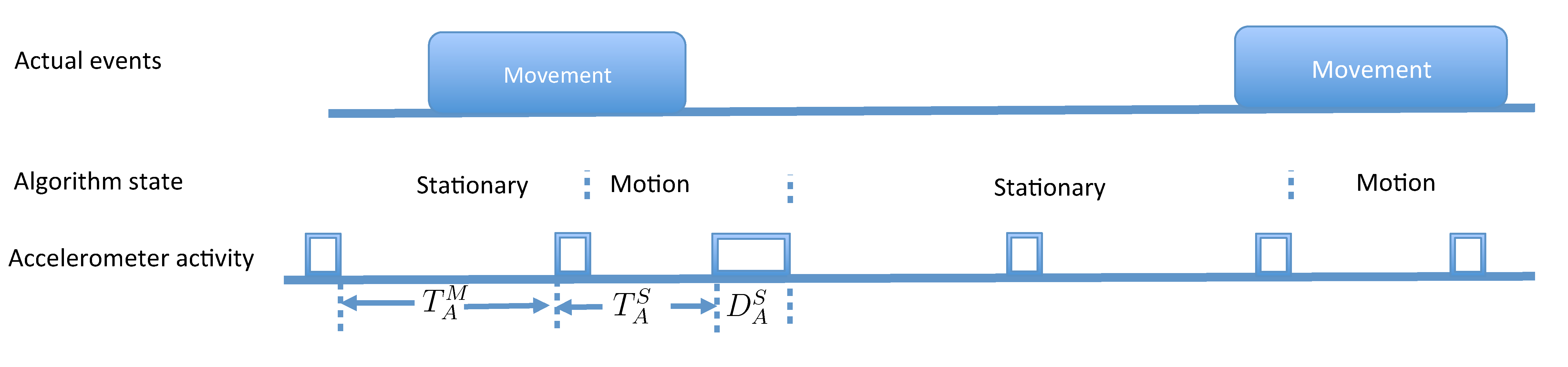 . To avoid spurious state transitions, we require the accelerometer to detect motion or non-motion for the duration of at least