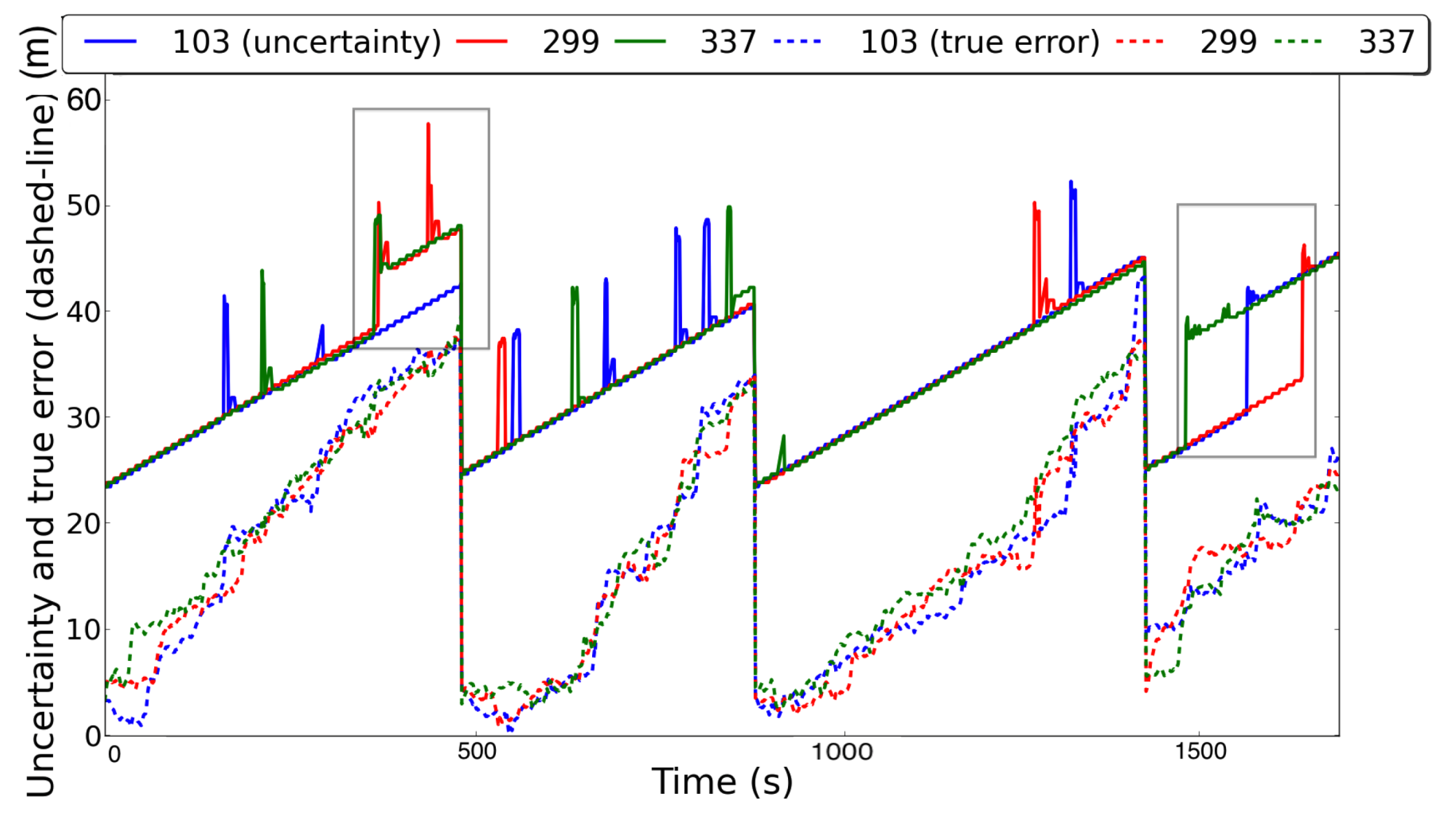 Figure 17 shows a trace of the uncertainty growth for 3 nodes from our empirical cattle dataset. The trace uses solid lines to indicate the algorithm uncertainty and dashed lines to indicate the true error for each node. At the start of the trace, all three nodes are growing their uncertainty linearly according to