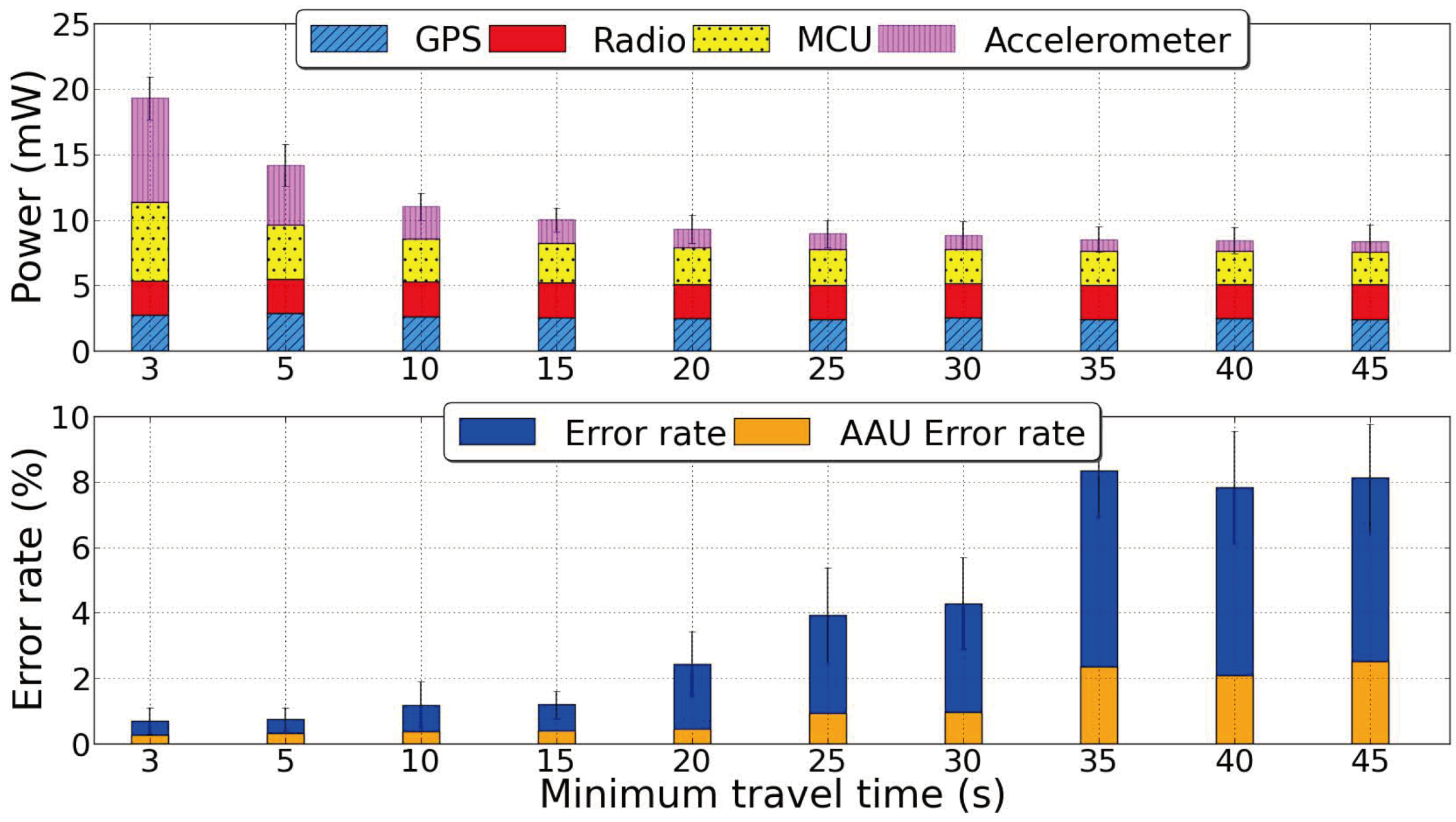 Figure 21 compares the results. Both flavours of our accelerometer duty cycling strategies reduce the power consumption by around 50% over the GPS duty cycling with radio ranging approach and 72% over the always-on accelerometer approach. This comes at the cost of an increased error rate that remains within our application’s 5% error tolerance. The higher error rate with accelerometer duty cycling is intuitive, as nodes slow down their uncertainty growth in stationary state until they detect movement. The bars for a travel time of 15 s show the performance of accelerometer duty cycling for applications with tighter accuracy constraints. This shorter
