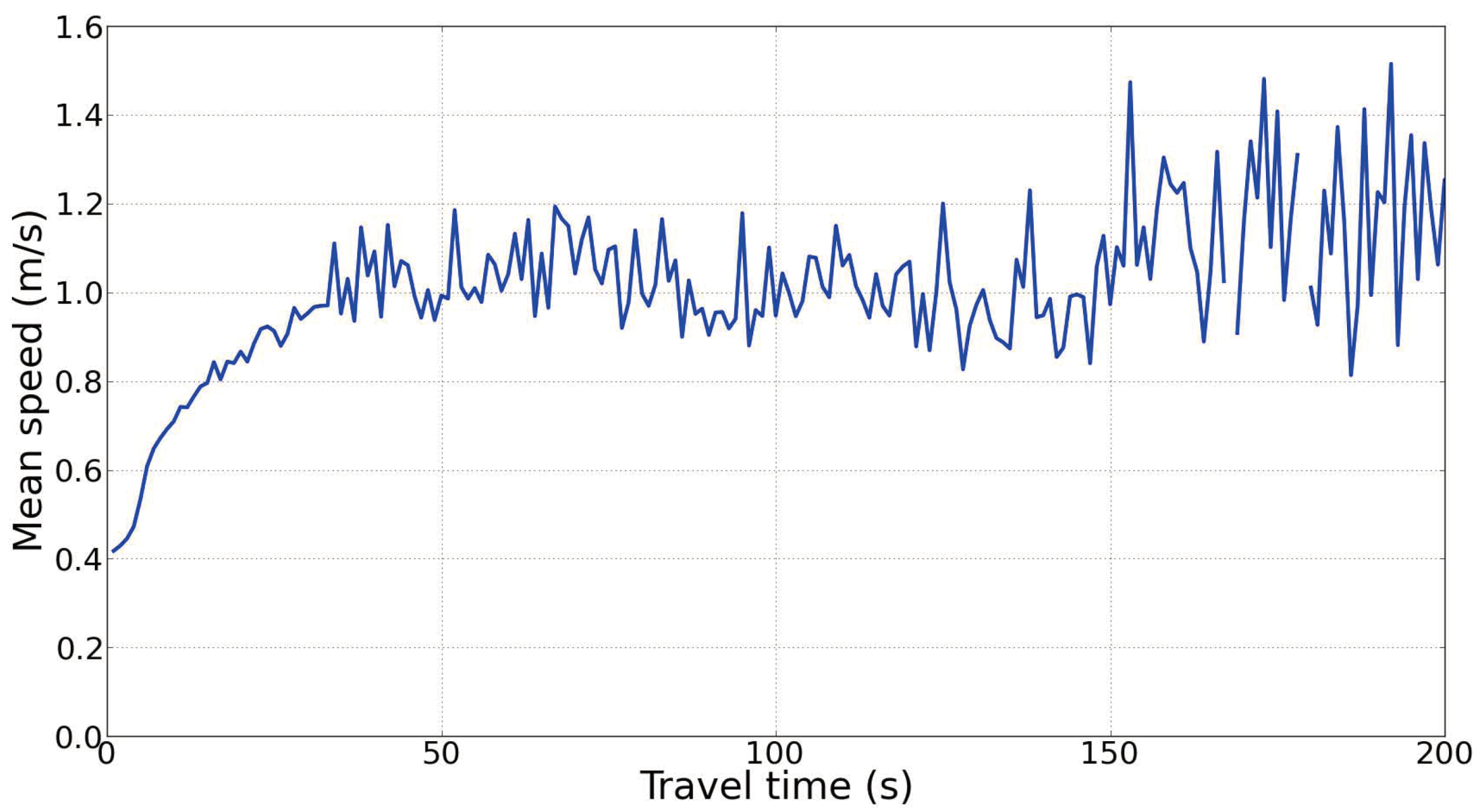 , after having logged contact with a common neighbour 104, whose trace is not shown here. At around t = 200, node 103 detects motion through its accelerometer, which results in a step increase in its uncertainty. However, in the following time instance, node 103 logs contact again with node 104 and reduces its uncertainty again. This happens again in the next cycle with a smaller peak, as node 103 has now switched to a shorter accelerometer duty cycle in motion state. After that, node 103 detects that it has stopped moving, and reverts to slow uncertainty increase. Nodes 337 and node 103 are in the same situation at t = 1,200, 1,250 respectively. At around t = 1,225, node 299 has a sharp increase in uncertainty before node 337 obtains GPS lock and lowers its uncertainty. This is a consequence of using the dynamic speed model with step increases in uncertainty upon motion detection. The last time node 299 got GPS lock, it had a speed of 0.8 m/s. It keeps this speed estimate until its next GPS lock. When it detects motion, it adds