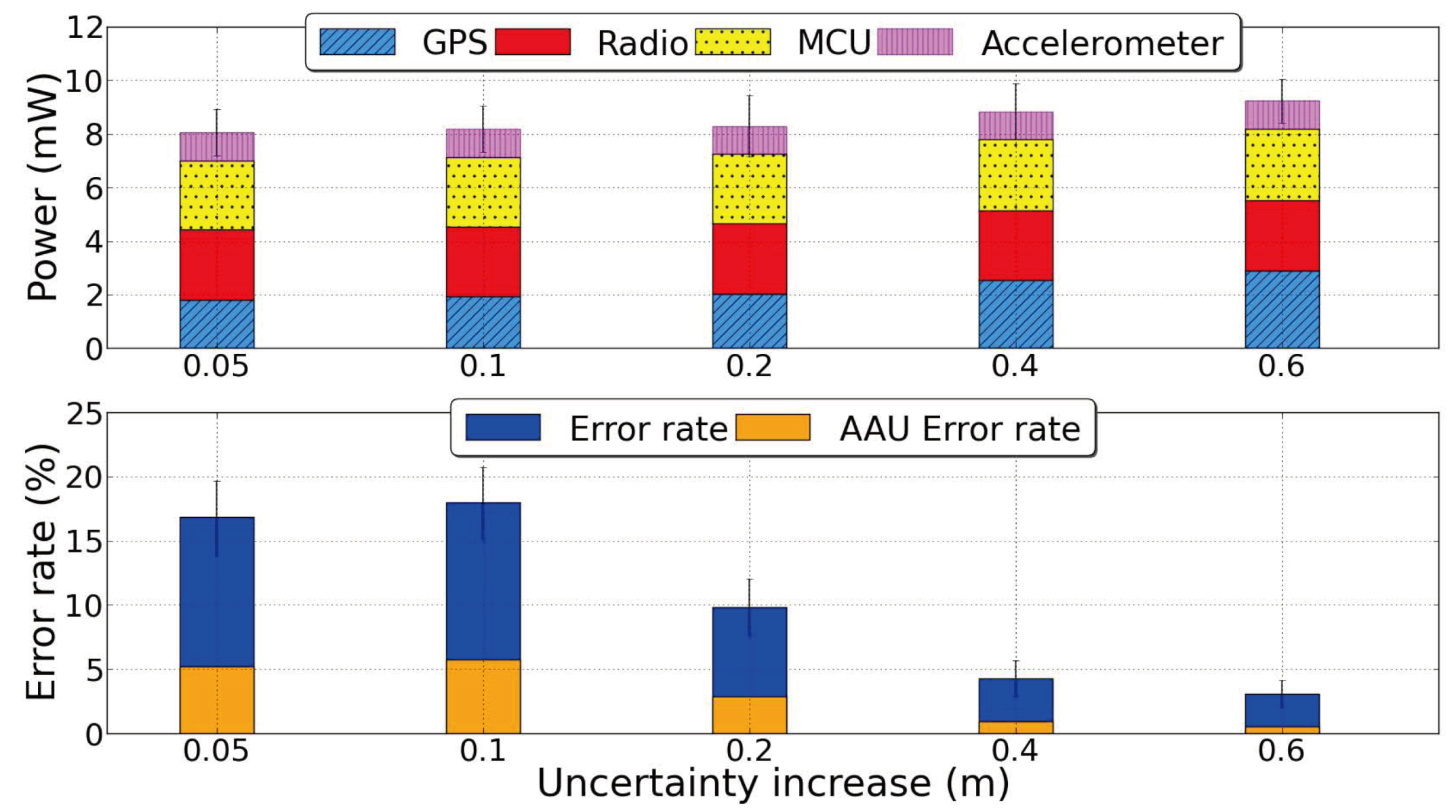 We evaluate performance of the tracking algorithms developed in this paper using three main metrics. Power measured in milliwatts is calculated as the mean power consumed by a node over the course of the experiments. We further break down the total consumed power according to the individual hardware components. Error rate is a σ measure of the localisation accuracy of our algorithms. It is calculated as the percentage of times when the localisation error was larger than the reported uncertainty. Finally, AAU (absolute acceptable uncertainty) is a user-set bound on the maximum localisation uncertainty of the tracking algorithm.