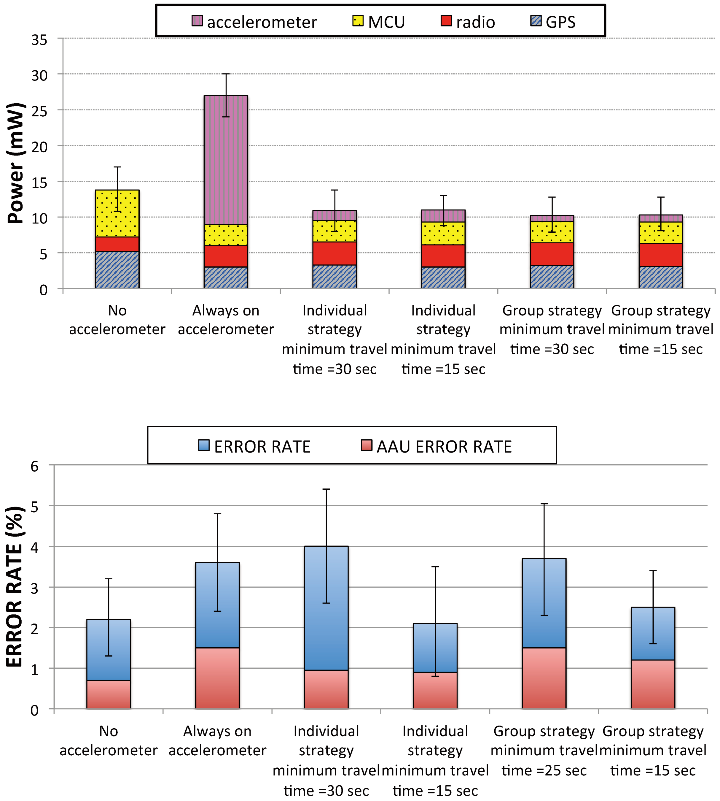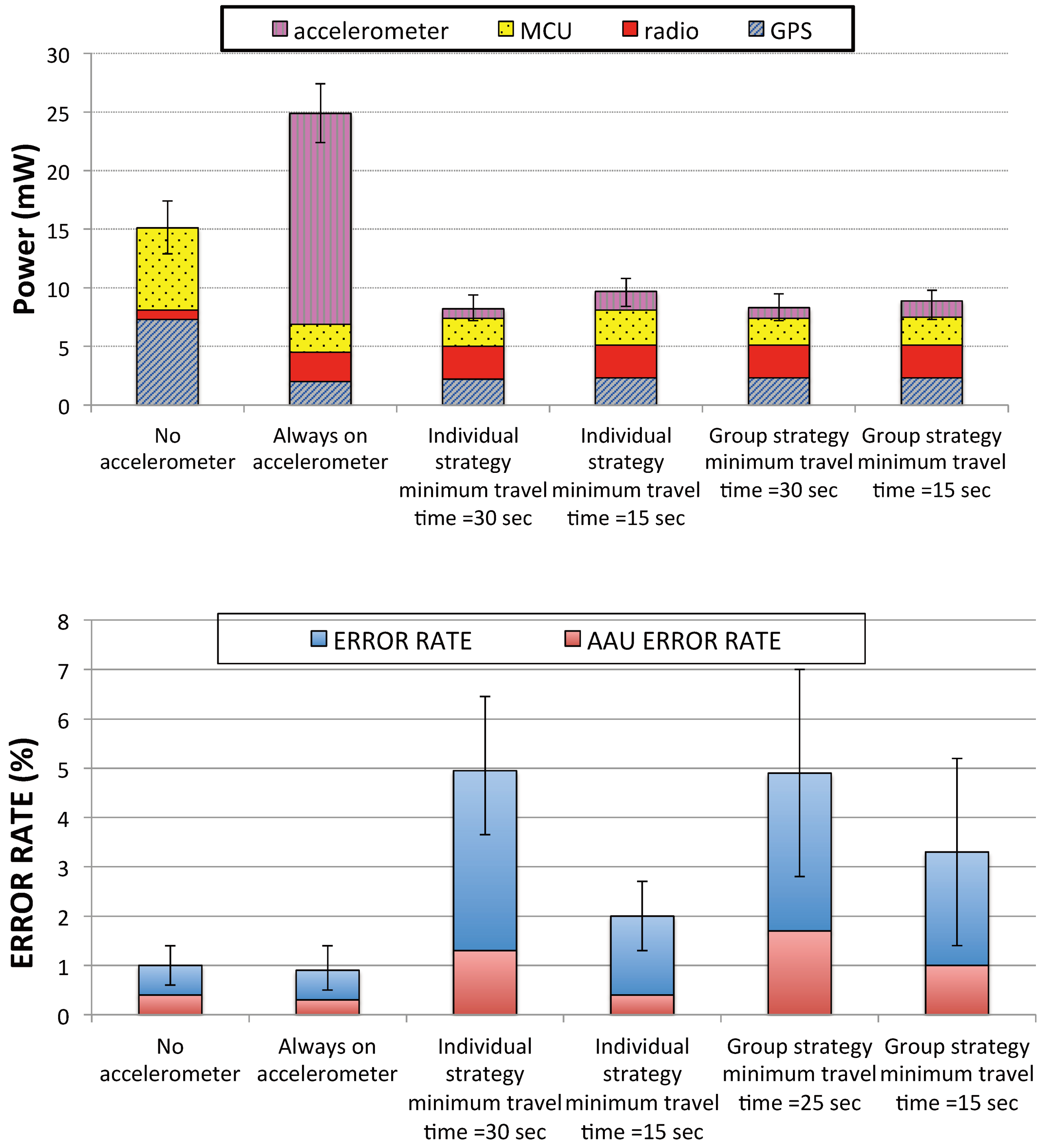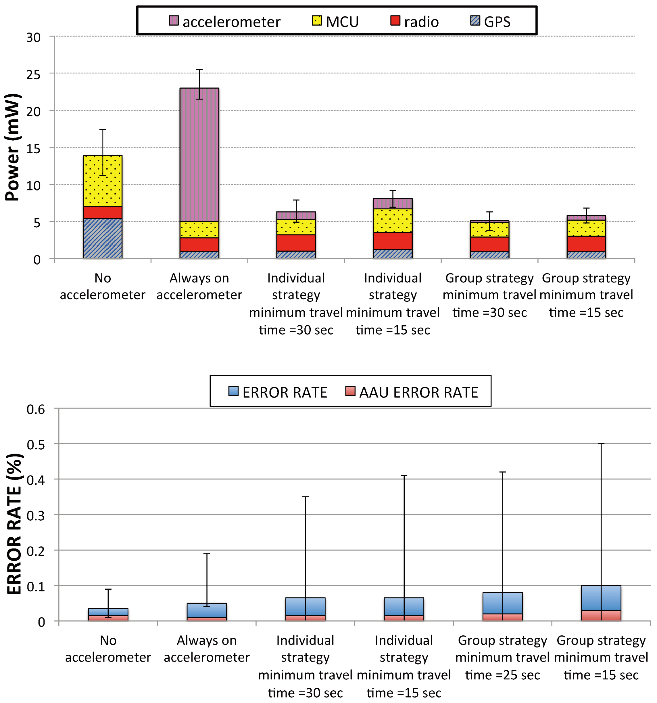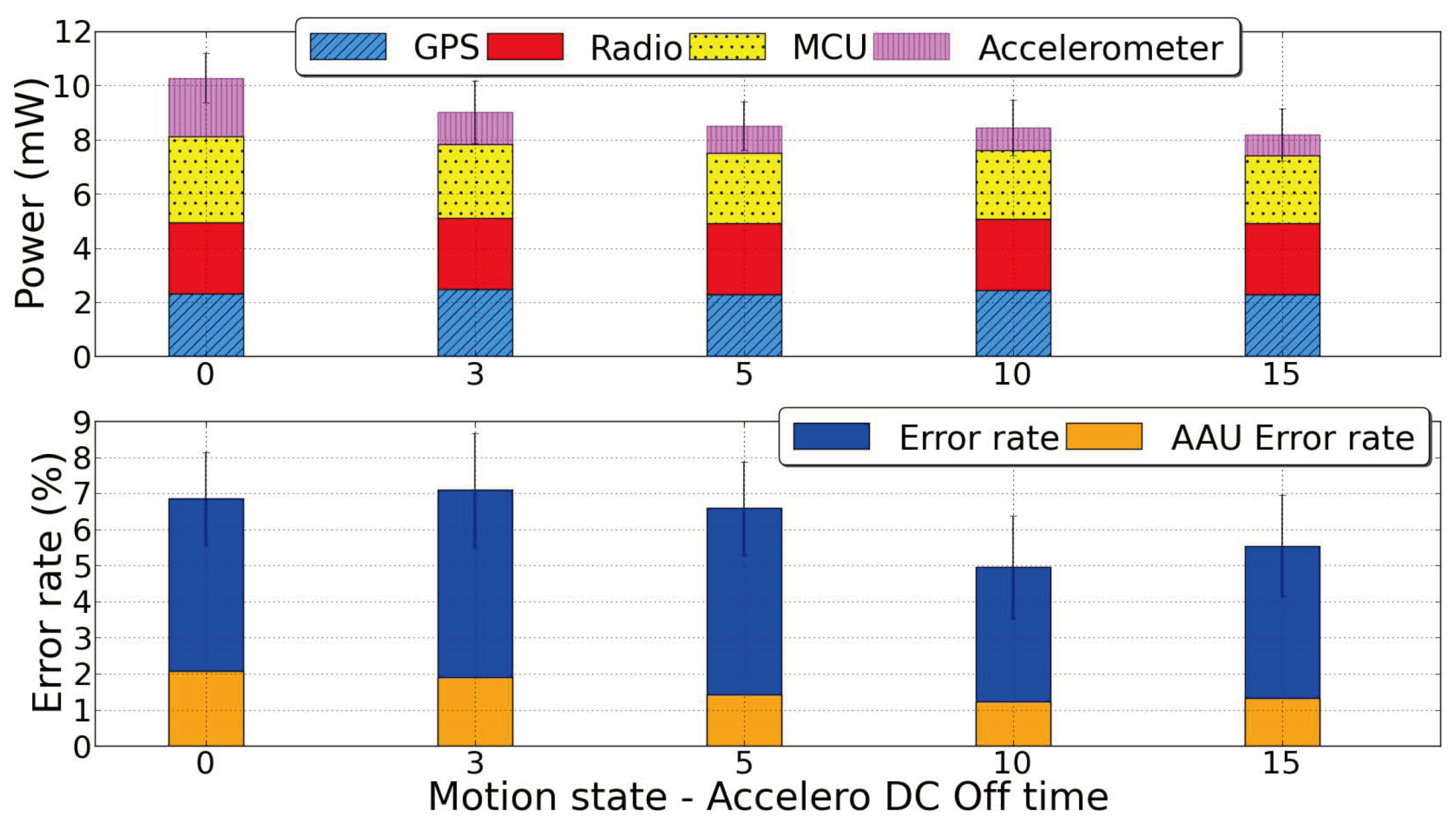 Next, we explore the case of rare movement events. We select the 3-hour time window from the data trace with the least number of motion events, and we run each of the duty cycling strategies for the all the nodes during that time window only. The results are shown in Figure 23. Both individual and group-based accelerometer duty cycling strategies significantly outperform GPS duty cycling with radio proximity (50%–65%) and the always-on accelerometer (65%–78%) in terms of power consumption, with a modest increase in error rates that remains well within the application-specific limit of 5%. The group-based approach delivers a further 20% improvement in power consumption over individual duty cycling, as the nodes that share the accelerometer sampling burden get to spend a longer time in off mode. Interestingly, a