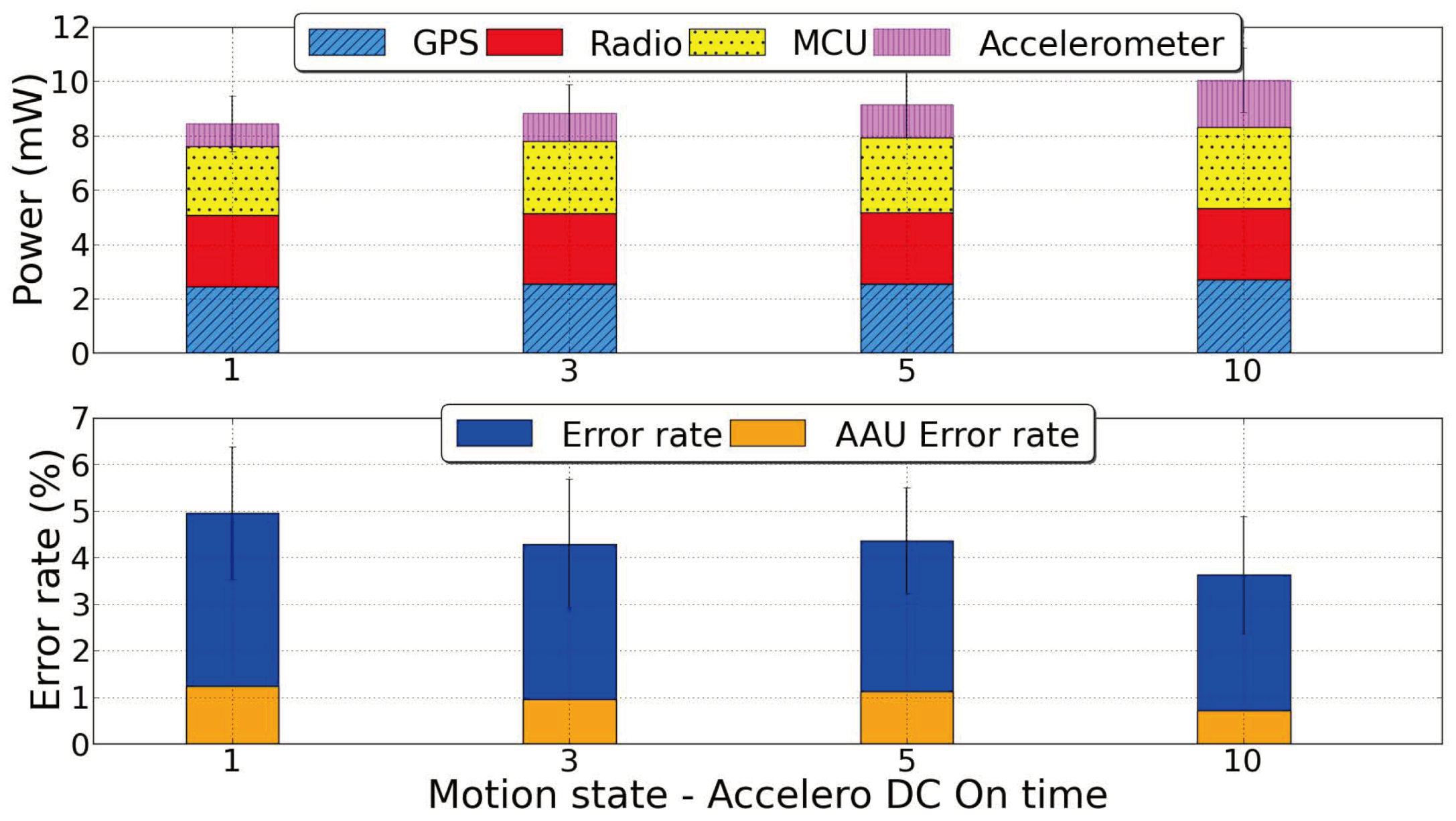 only causes minor increases in power consumption (about 1 mW for individual duty cycling and less than 0.5 mW for collaborative), while reducing their error rates to 2% and 3.5% respectively. Group duty cycling saves about 10% in power consumption over individual duty cycling, as nodes can set longer accelerometer off time. This comes at an increase of 1.25% to the error rate, since the longer accelerometer off times increases the likelihood of missed motion events.