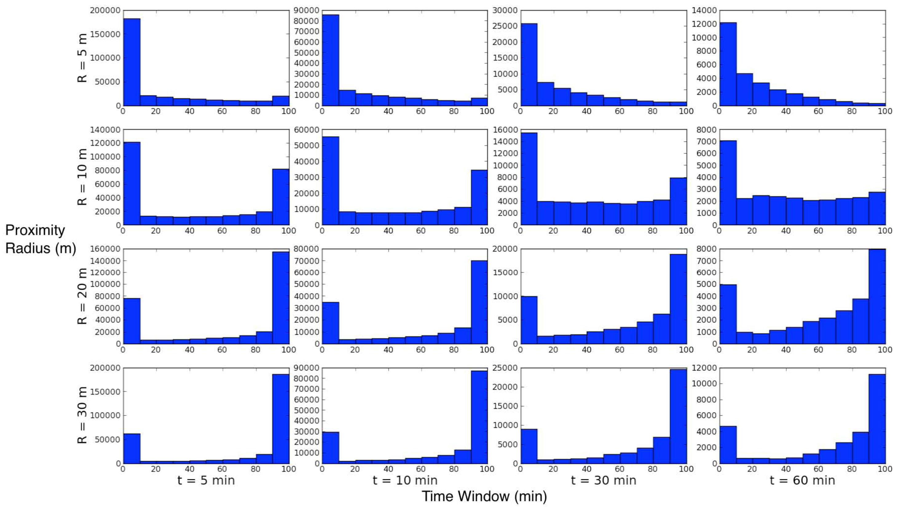 Having selected a group radius of 10 m and a neighbour history time window of 30 min, we refer back to Figure 14. In particular, our simulations point to the plot in the second row and the third column (R = 10 m and T = 30 min) of that figure. We seek to select the value of the proximity threshold δ that captures to classify true neighbours from transient ones. We are effectively aiming to draw a vertical line on the plot that separates these two classes of neighbours.