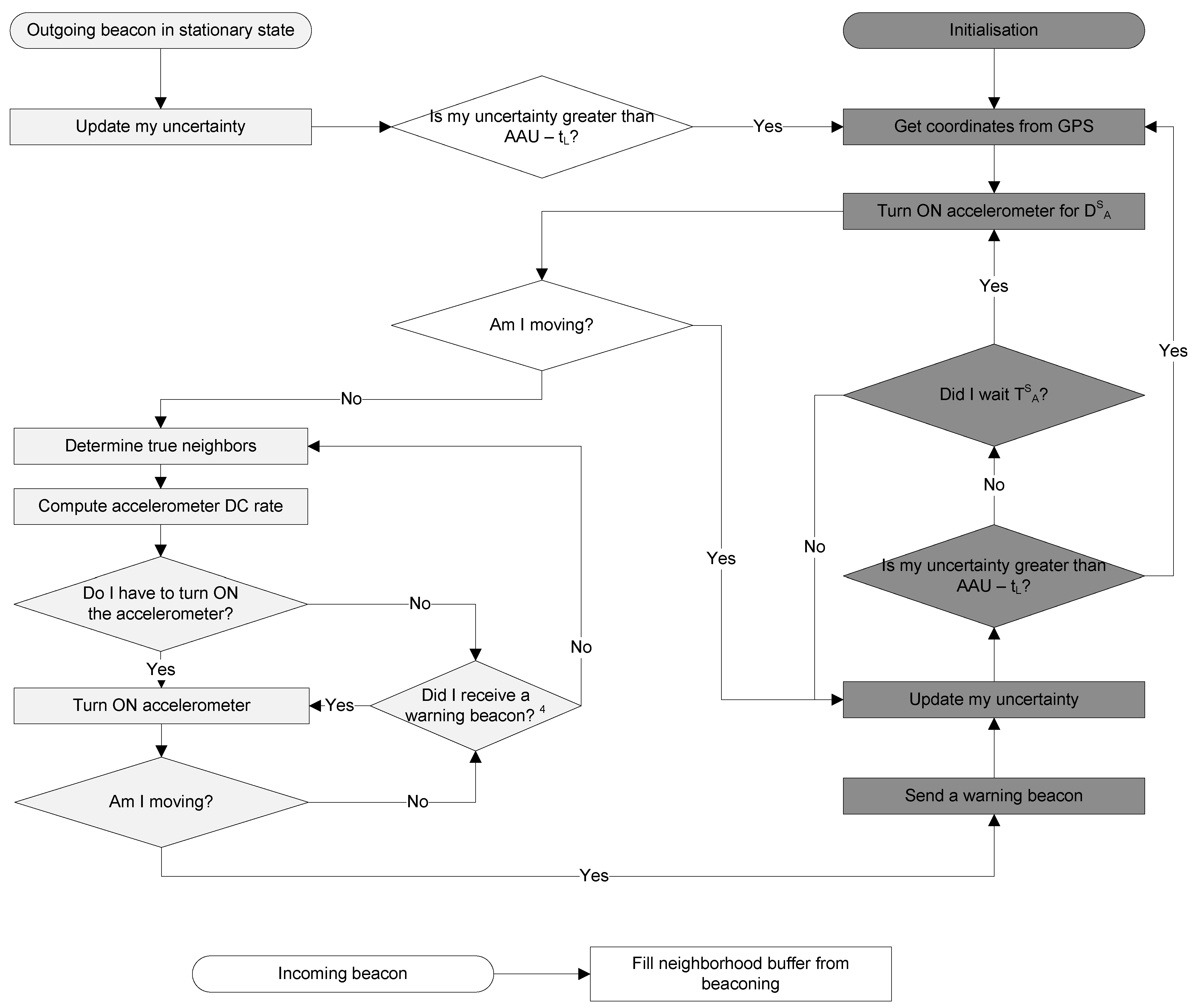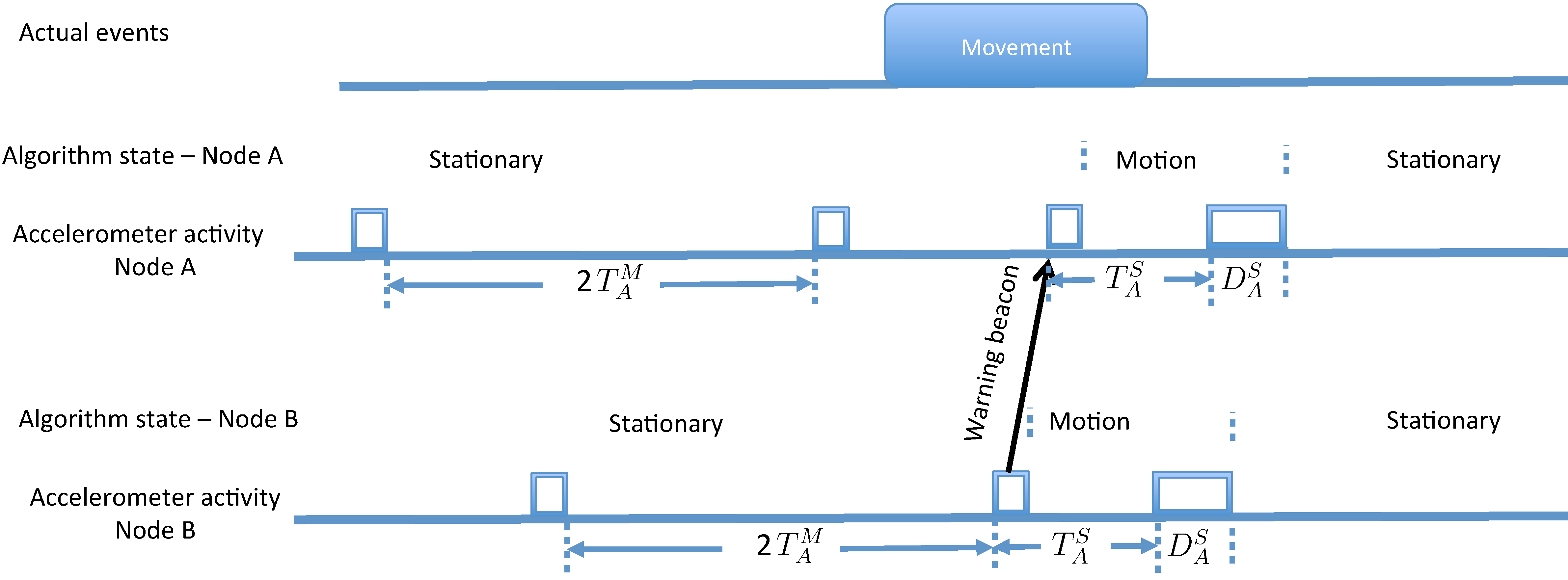 , the node leaves the stationary state and broadcasts a warning beacon to all of its neighbours. All neighbours that receive the warning beacon sample their accelerometer immediately to determine if they too have started moving. If so, the neighbours also enter the motion state, and otherwise, they stay in the stationary state.Nodes that enter the motion state increase their uncertainty by