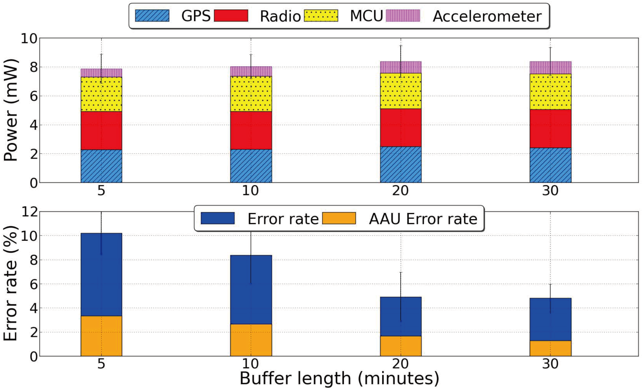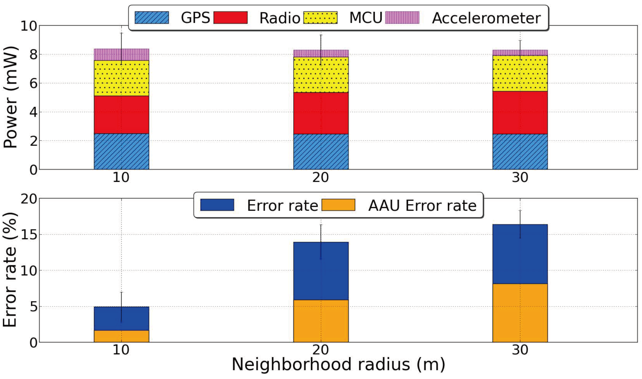 Notably, the algorithm with no accelerometer consumes significantly higher energy for powering the GPS module and the MCU, while consuming less than half the energy for radio communication. The higher GPS power consumption is clearly because of the more frequent GPS fixes in the absence of accelerometer triggering. The MCU power consumption is also higher because the MCU has to remain active while the GPS is powered on (see overlap parameter in energy model). The radio power consumption is lower for this algorithm as it uses event-based beaconing, while both individual and group-based duty cycling use periodic beaconing. The results clearly show that the added cost of periodic beaconing is well worth the savings in GPS and MCU power consumption, which result from a significant decrease in the frequency of GPS fixes.
