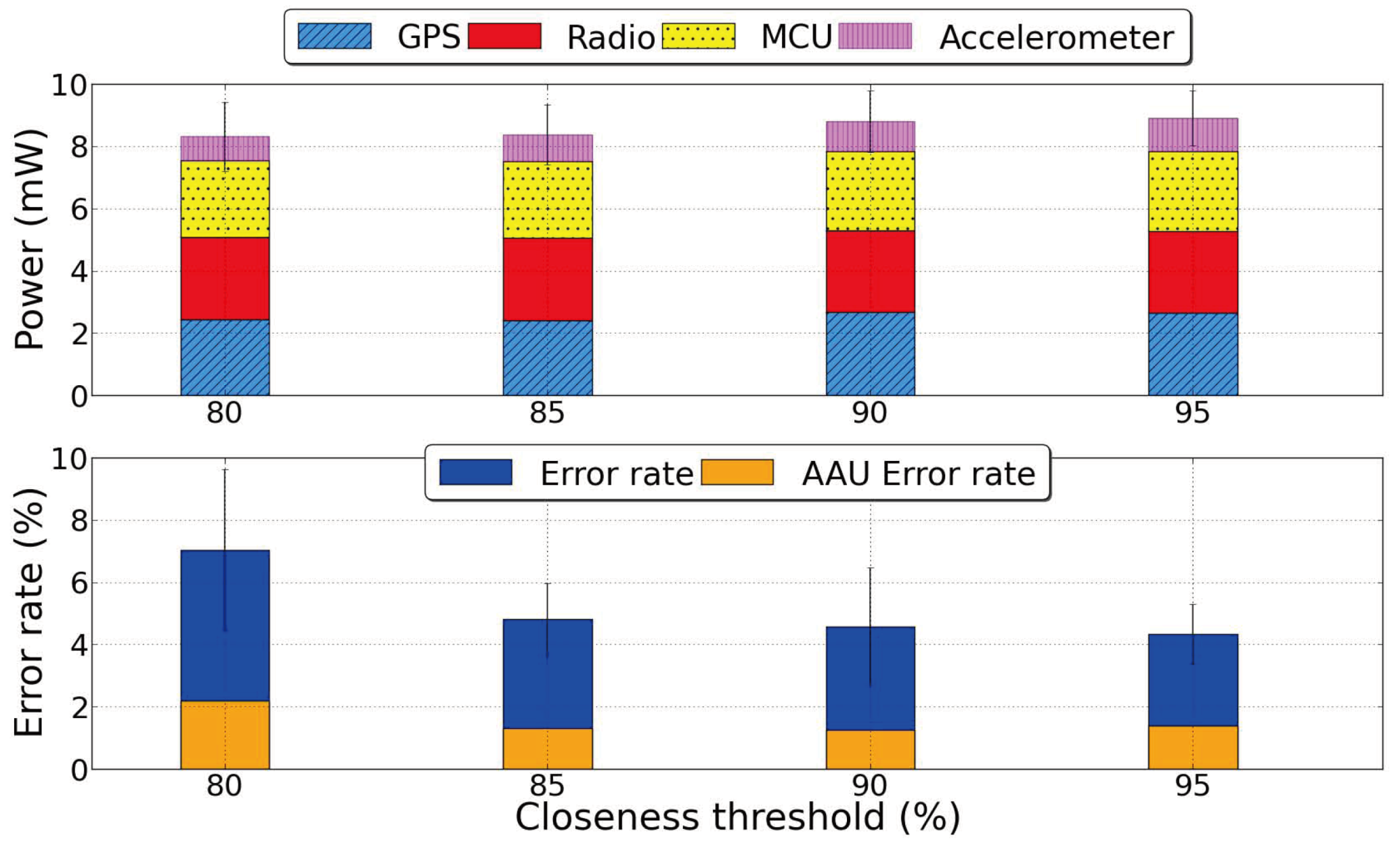 We evaluate four values for the proximity threshold between 80% and 95% in separate simulations. The resulting power consumption and error rates are shown in Figure 20. Higher thresholds improve error rates as they are more conservative in labelling useful neighbours. They also lead to smaller groups, which reduces the savings of group-based duty cycling. We select a threshold of 85% as the most energy efficient value that meets our application’s error tolerance of 5%.