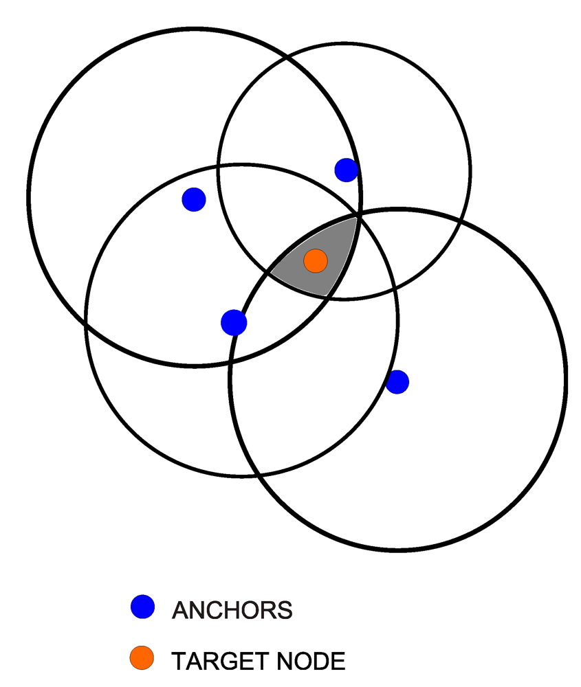 The lateration problem consists in determining the position of a node (i.e., the target node) in the space based on its distance from other nodes with known positions (i.e., the anchors) [27]. To address the lateration problem in a plane, three anchors are needed usually. Using the anchor positions and the distances, the target node position has to be at the intersection of three circles centered at the anchors. A common issue is that distance measurements are often imperfect and the intersection of these circles does not, in general, result in a single point. To overcome these imperfections, distance measurements from more than three anchors can be used (the higher the number of measurements the better), resulting in a multilateration problem [28,29,30,31]. Figure 1 shows a representative scenario with four anchors, where the distance measurements brought to the grey area represent the intersection of the circles as well as the area within which the target node is expected to be located.