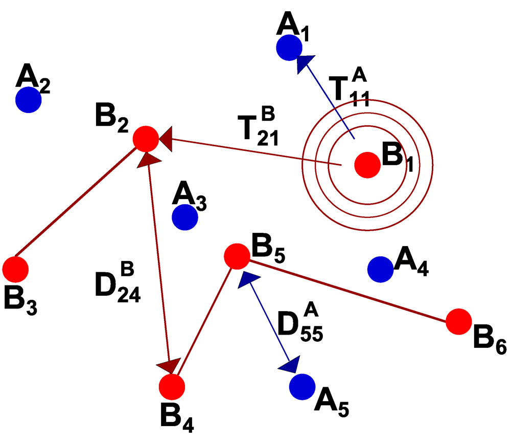 Our objective is to estimate the power of the transmission signal of node Bk as seen by node Bj, which we call BTjk. To this we make use of anchor nodes with known position. The set of anchor nodes is defined as the set A = {1, ...,Ai, ...,ANA}. These are the sniffers used in our measurements. Indeed, we may have only one sniffer that changes its position over time and makes several measurement sessions or many sniffers that make measurements in parallel. Note that each sniffer Ai performs measurements of the signal coming from every blind node. The signal transmission measurements performed by the anchors are represented by TAik. For every i, we expect to have a measure for any blind node k, with k = 1, ...,NB; however, due to the distance and the presence of occluding objects, some of these measures can be set to zero, meaning that the anchor has not been able to detect any signal from blind node k. The measurement TAik is usually obtained as the average power measured for a set of packets received during the sniffing time, and its accuracy clearly depends on the length of the observation time and the transmission frequency of blind node k. Specifically, herein without loss of generality, we refer to the RSSI (Received Signal Strength Indication) measures.