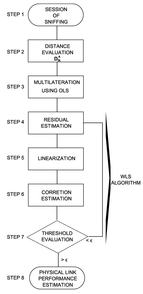 The structure of the paper is the following. In Section 2 we review past works related to performance monitoring in WSNs. In Section 3.1 we define the multilateration problem in estimating the position of the nodes in the network and describe the weighted least squares algorithm applied to the method of indirect observations. In Section 4 we present the proposed approach for the passive monitoring of the WSN physical layer and in Section 5 we provide the analysis of the effectiveness of the proposed approach through experiments in realistic scenarios. Final conclusions are drawn in Section 6.