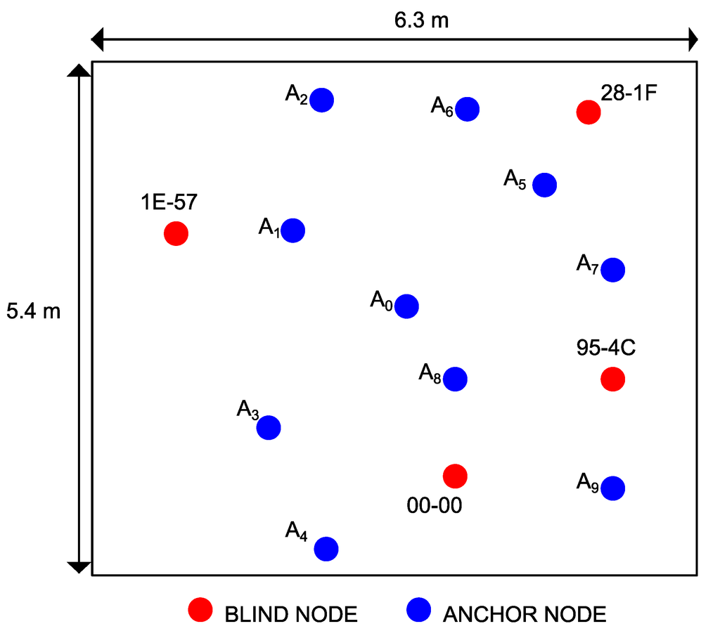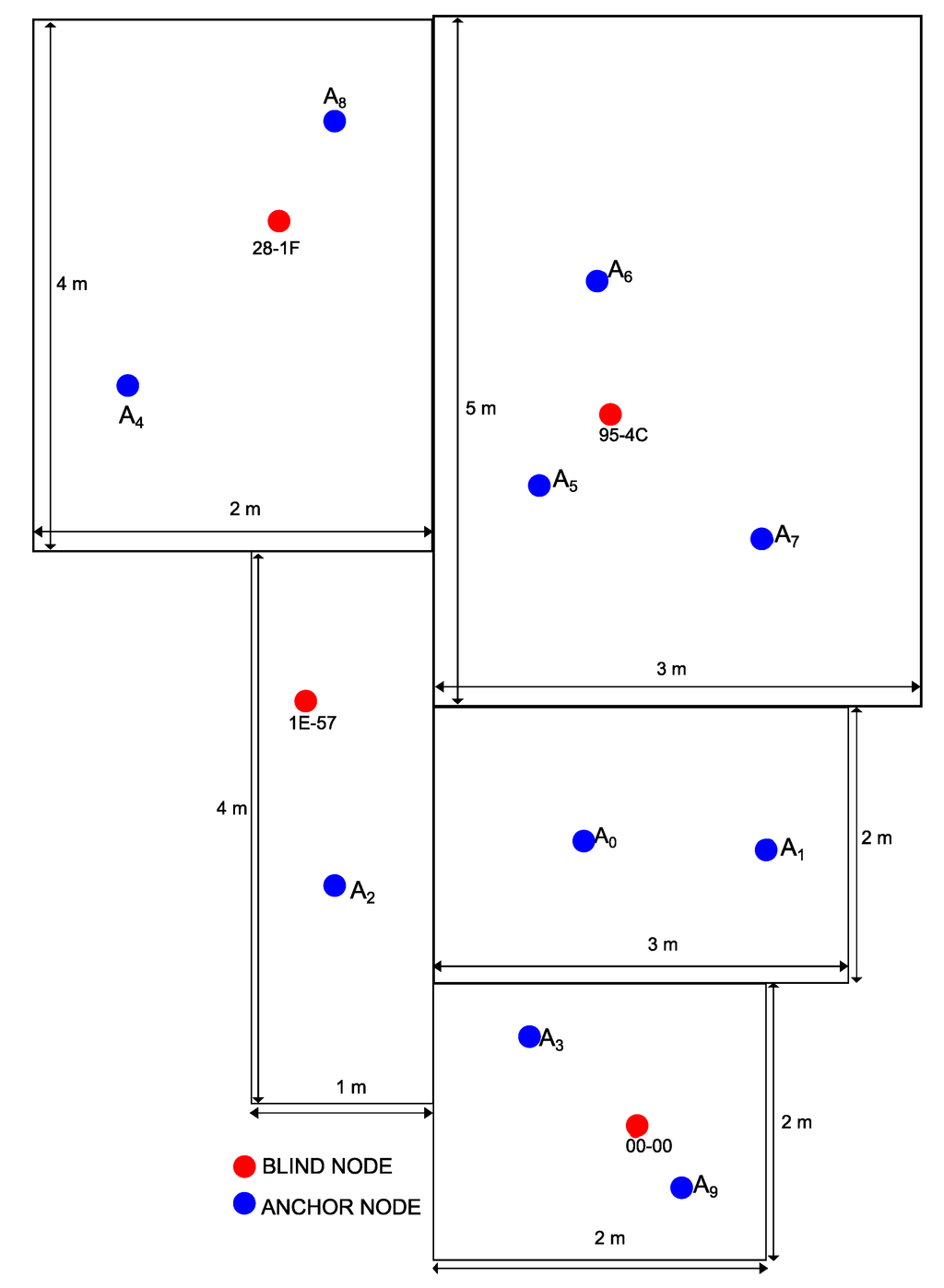 Through the serial port, the sniffer was connected to a laptop running Wireshark together with the SRManager Tool. For each position, the sniffer captured around 1000 packets from which we extracted the RSSI values from the IEEE 802.15.4 packets. This value is a measure of the power of the received signal as measured by the receiving device. In our scenarios, the receiver is the sniffer and the transmitters are the blind nodes building the PAN. For each packet with the same source node address, we extracted the RSSI and computed the arithmetic average of all the resulting values. Indeed, these measurements are affected by the peaks caused by a multipath fading, since in the indoor scenario a small variation of the environment can significantly affect the signal strength. This process is replicated for each anchor position. Finally, we obtained ten sets of observations, each containing information about the average RSSI value between the anchor node and the blind nodes. Table 2 shows the average RSSI values for the three scenarios.