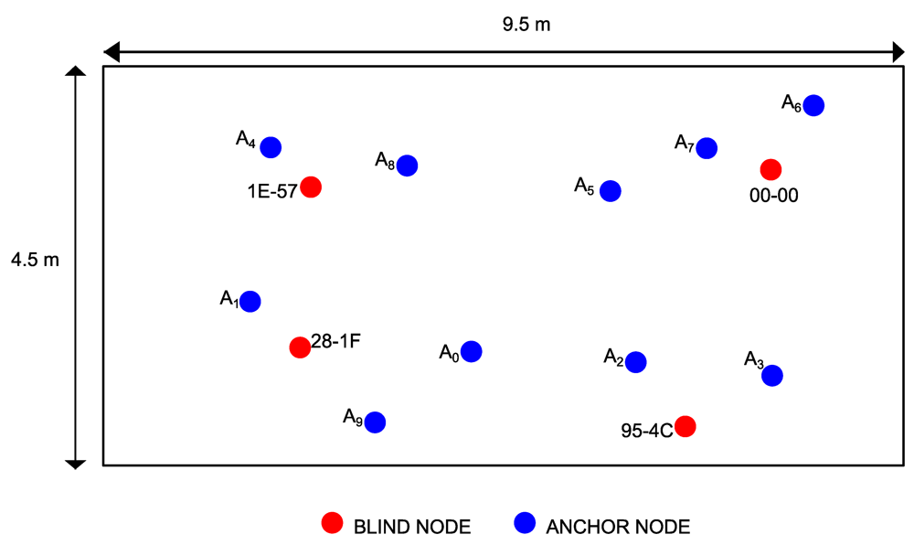 During the experiments we used the standard ZigBee channel number 14 in the 2.4 GHz ISM frequency band. For each scenario, the blind nodes (NB = 4) have been placed randomly and then switched on; then, the sniffer has been moved again randomly in ten positions (NA = 10) to perform the required sniffing session. The network nodes are identified by their network 16-bit address: 00-00, 95-4C, 1E-57, 28-1F. For each position, the sniffer captures the first 1,000 packets generated by each active node and exchanged in the PAN network. We firstly performed the campaign of RSSI measures by the sniffer; secondly, we applied the model of indoor propagation to estimate the distances; and thirdly, we used the approach discussed in Section 4 to estimate the physical link performance. Figure 5, Figure 6 and Figure 7 show the locations of both the blind nodes and the sniffer for the three scenarios. Note that in these figures, the origin of the Euclidean space has been set to the first anchor position.