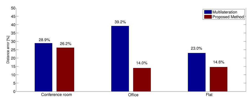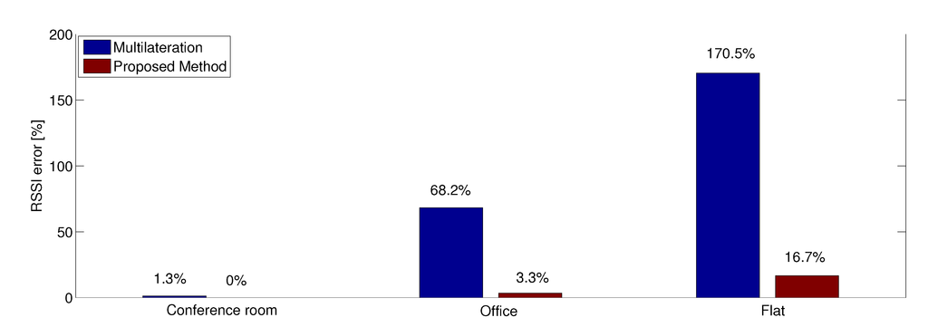The estimation of physical layer performance is clearly improved with the application of the indirect observations (“ proposed method” columns in Table 4). This method achieves significant improvements also in the scenarios characterized by the problem of large environments discussed before, allowing for compensating multipath fading effects due to the presence of more consecutive obstacles. As show in Table 4, it allows for reducing the RSSI estimation error from the results obtained with the application of the multilateration algorithm of 1.33 dB for the conference room scenario, 5.5 dB for the office room scenario and 5.85 dB for the flat scenario. The more complex is the scenario, the higher are the benefits of applying the proposed algorithm. With respect to the distance estimation, the RSSI evaluation presents lower errors. This is due to the fact that the RSSI and the node distance are linked by a logarithmic relationship, as discussed in Section 5.2. Accordingly, a big error in terms of distance does not correspond to a big error in terms of RSSI if we analyze the relationship where the curve of path loss has a little slope.