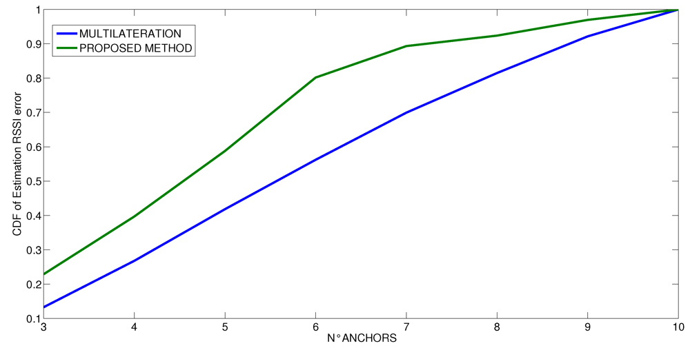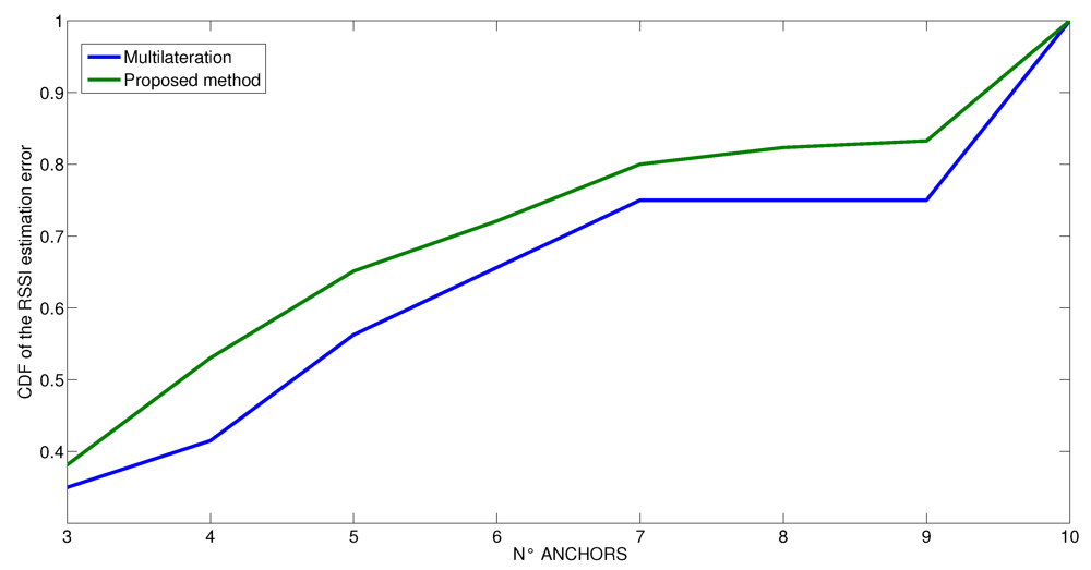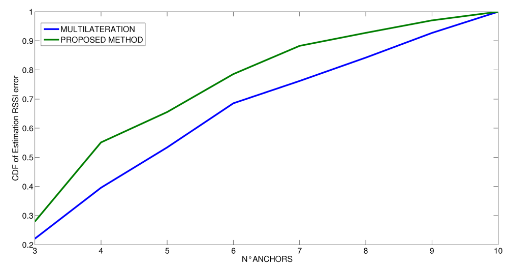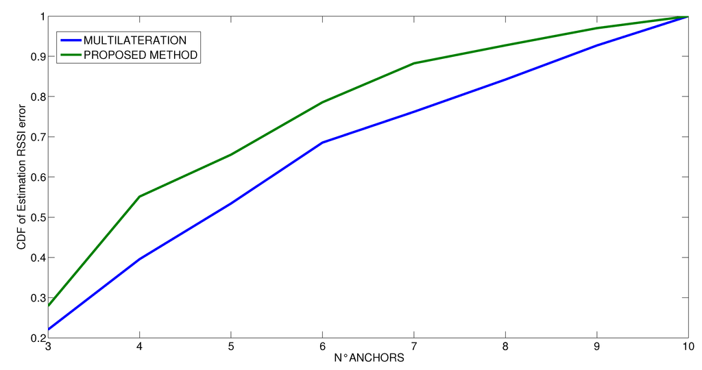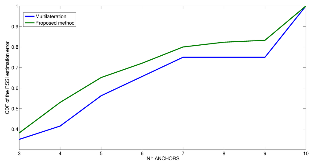 We also performed some runs that vary the number of anchors in the estimation of the distances. The results are shown in Figure 11, Figure 12 and Figure 13, where the vertical axis shows the CDF (Cumulative Density Function) of the RSSI estimated error value and the horizontal axis shows the number of anchors used in the estimation process. At first, we have performed the experiments by using the entire set of ten anchors, and then we iteratively removed one anchor in sequence, estimating again each time the RSSI value. These experiments are intended to analyze what is the needed number of anchors to achieve a given error. This is important to either limit the time spent to perform the measurements when only one real anchor is used at different positions or to reduce the number of different anchors used in parallel. In any case, the minimum number of anchor measurements is clearly three. Looking at the curves, we see at first that the behavior is different for the three scenarios. In the first scenario, which is the simplest one, as soon as the minimum number of anchors has been exceeded (three), the probability of the estimation is not affected by error. Indeed, it increases linearly until 7 anchors are used, then the value is stable until 9 anchors are used and then it increases rapidly with 10 anchors. In contrast, in the other two scenarios, the number of anchors is very important, and the estimation would benefit from using more than only ten anchors. In any case, it is possible to note that the probability that the estimation process is not affected by error increases according to logarithm mode and the probability to have some errors decreases after the application of indirect observations for any number of anchors. The improvement of the proposed method is more visible when the number of anchors is low. In all scenarios, the proposed method increases the probability that the RSSI estimation is not affected by error; indeed, in all the considered cases, the CDF of the proposed method is shifted upwards with respect to the CDF of the multilateration method. On average, thanks to the proposed method, the probability to have a correct RSSI estimation is improved by 15%.