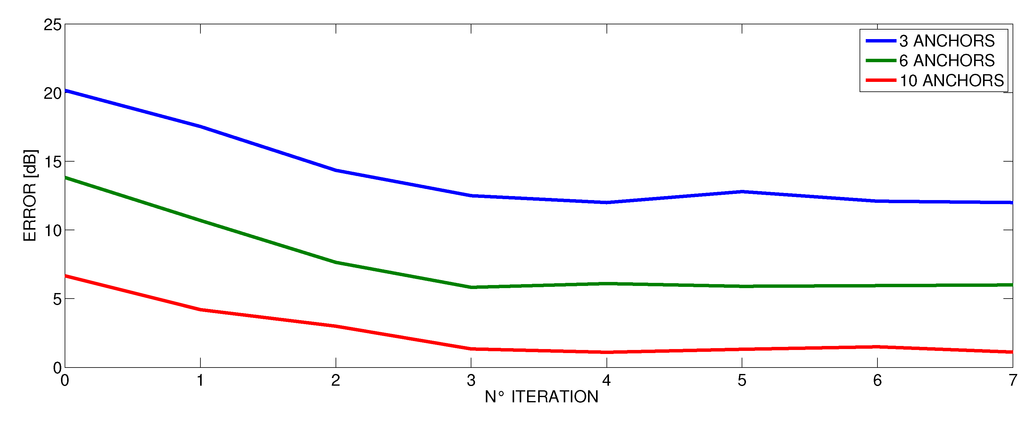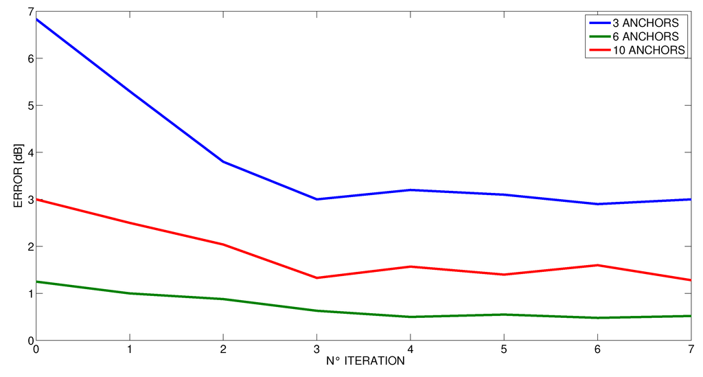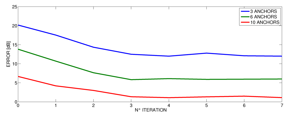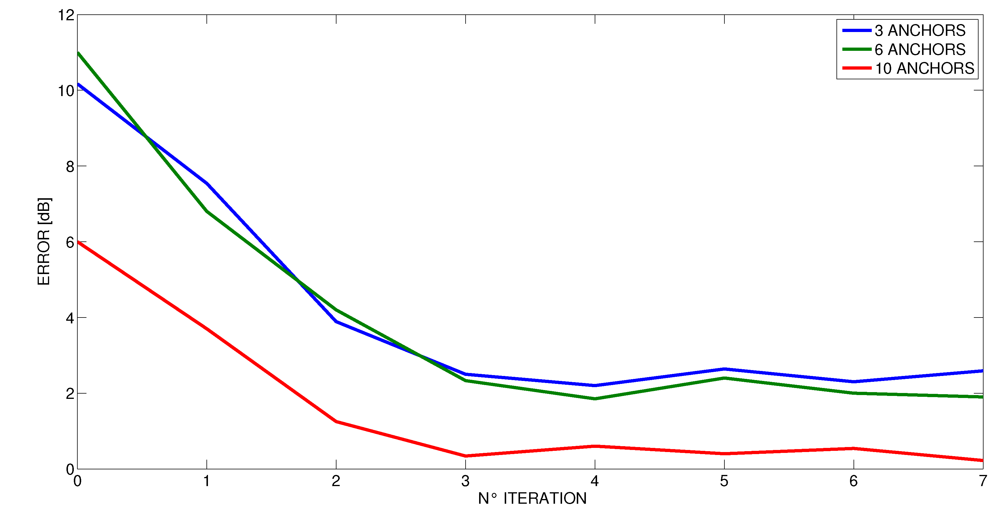 When performing the proposed iterative method, we have empirically observed that after three iteration, the gap (δx, δy) is very small and comparable with the variance of the result σ. Therefore, in our experiments, we stopped the method after having performed just three iterations (the results shown before refer to this setting). However, we wanted to further investigate this phenomenon, and in Figure 14, Figure 15 and Figure 16 we present the average error as the number of iterations in the proposed method increases at different number of anchors. These curves confirm that after three iterations, the method does not benefit from performing more steps for all the cases. Indeed, even the number of anchors does not seem to affect the number of iterations that are needed to achieve a stable result. Accordingly, this number appeared to be a good trade-off between computational costs and accuracy.