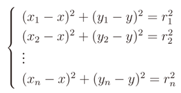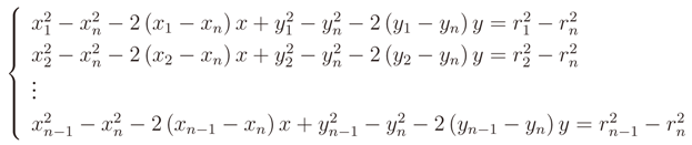 where n is the number of anchors, vector p = (x, y) is the position of the target node, vectors ai = (xi, yi) are the position of anchor i, and ri is the distance measured from anchor i to the target node. This system can be written with the following matrix equation