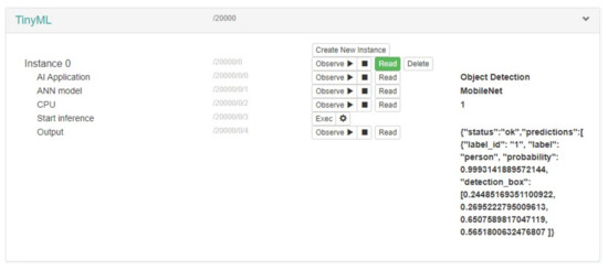 Figure 4 shows the VIO web interface inherited from the Leshan server. The interface enables users to issue OMA LwM2M methods like READ, OBSERVE, and EXECUTE. The same interface can be reached using HTTP GET, PUT, POST, etc., which are bound to a CoAP request. The bold text in the right side of the figure is the result of queries on resources. The user can choose to query the single resource or the entire instance. In the second case, it will receive the available data of all resources with READ functionality. In particular, the result of resource Output is a JavaScript Object Notation (JSON) representation of the inference result provided by an object detection algorithm.