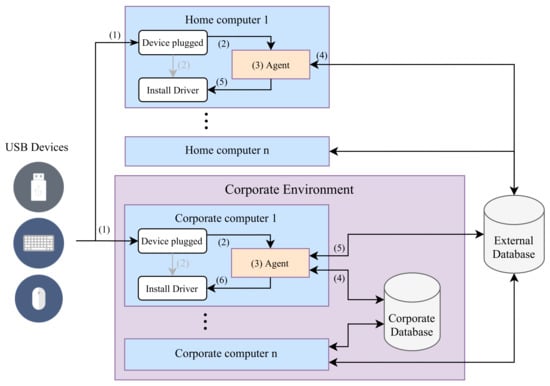 Figure 2 details the internal procedures inside each computer with an agent. First, when the agent starts, it blocks the PnP device installation on Registry (1), collects all the information of the devices mounted on the system, and inserts this in a list.