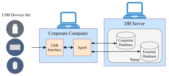 The proposed distributed agent architecture was implemented as a functional prototype with the topology presented in Figure 3. The topology is composed of a corporate computer and a DB server. The corporate computer features an i7-6700HQ CPU, 16GB DDR4 2133MHz of RAM and 256GB M.2 SSD of storage capacity. The agent was developed using C# programming language and deployed in a Microsoft Windows 10 Pro Creators Update, version 10.0.15063. The DB server runs on a computer featuring an Intel Core 2 Duo, with 4GB DDR2 of RAM and a 125GB Kingston SSD. In the DB server, a WampServer [40] was configured with two MySQL DBs, a Corporate and an External DB.