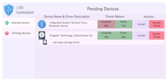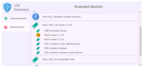 When running and inserting USB devices, the agent presents an User Interface (UI) with two tabs: analysed devices and pending devices. Figure 4 presents the analysed devices tab, with the working devices on the system. Figure 5 shows the pending devices tab, with a filtered list of pending devices and their threat assessment from Corporate DBs and External DBs. In this tab, the User Experience (UX) enables users to accept devices or declare a threat, thus blocking the device.