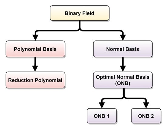 Finite field requires that a basis is selected to perform field arithmetic. Figure 2 represents what needs to be defined accordingly to the chosen basis. For binary field, if the polynomial basis is chosen, each element is a polynomial, and therefore, field operations make use of polynomial arithmetic [25]. A reduction polynomial must be defined to reduce the results of its arithmetic into elements of Galois field [26]. Reduction polynomial will ensure that the given result belongs to the field.