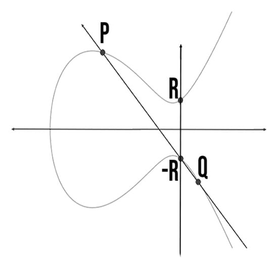 - Point Addition: Consists in adding a point with another point. Assume two points and , in which and . Then, [25]. Point should be reflected the in x-axis to compute point R. Figure 3 shows the point addition on ECC.
