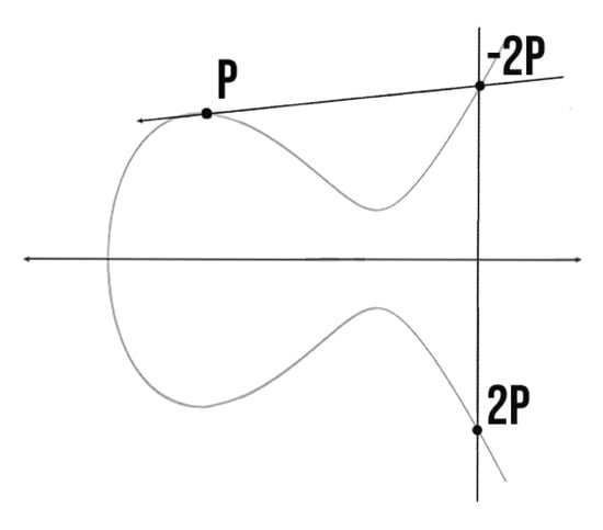 - Point Doubling: Is the addition to a point with itself, when . Let , where , then [18]. Point doubling is evaluated in the same way as point addition, as also generates first , which is reflected in x-axis to compute point . Figure 4 shows the point doubling on ECC.