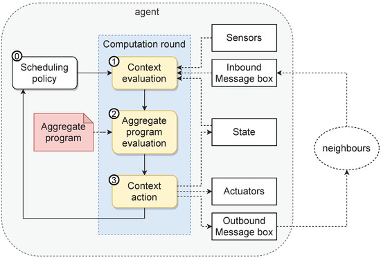 Such an abstract aggregate execution protocol can effectively be used to define an agent control architecture (Figure 1). Variants of such a control architecture can also be envisaged, e.g., by considering asynchronicity and different rates for context evaluation, computation, and action. Preliminary work supporting this direction can be found in [37,38], where partitioning schemas and programmable schedulers are proposed.