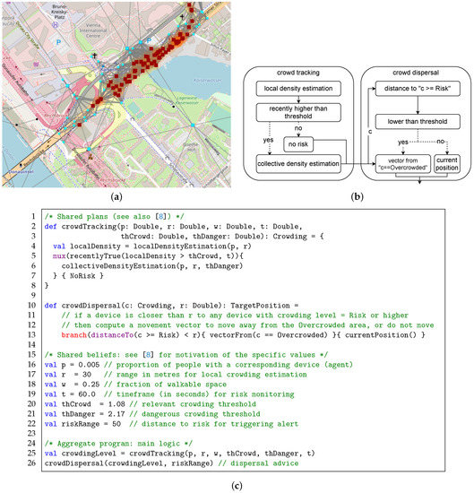 As a running example, consider a crowd detection and steering application [8] (cf. Figure 2a). When this application is built with the aggregate paradigm, the crowd is represented as an aggregate system consisting of a large-scale, dense network of smartphone- or wearable-augmented people—co-located in a spatial region such as a public exhibition area, a concert, or a stadium. An aggregate program can be continuously played by this system, providing each agent with an estimation of the local density, a local risk level, and possibly—if the vicinity to risky areas exceeds a certain threshold—advice for safe dispersal (in terms of a field of movement directions). In ScaFi, such a program may be implemented, reusing a library of general-purpose aggregate components [10], as per Figure 2c. Function crowdTracking (Line 2) runs a collective crowding risk estimation process, by calling collectiveDensityEstimation (Line 6), and selects the corresponding output (i.e., a crowding value—NoRisk, Risk, or Danger) only for the devices for which the perceived local density exceeds threshold value thCrowd; for the others, the output is NoRisk. Function collectiveDensityEstimation (whose code is not shown) may, e.g., using the building blocks in [10], break the system into multiple areas, compute the mean local density in each one of them, and share to all the members the area-wide crowding level (based on whether the average density exceeds threshold thDanger). Then, function crowdDispersal (Line 10) provides a suggestion for dispersal for all the devices that are closer than riskRange from any device with crowding level Risk; the suggestion is essentially computed as the opposite of a vector pointing to the center of mass of a close Overcrowded device group. We remark that, though the aggregate program is unique (essentially like a shared plan for all the involved agents), its execution is distributed (i.e., decentralized) and local (i.e., with agents interacting with neighbor agents only), hence enabling scalable collective computations.