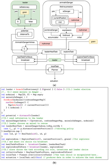 - Casadei, R.; Viroli, M.; Audrito, G.; Damiani, F. FScaFi: A Core Calculus for Collective Adaptive Systems Programming. Leveraging Applications of Formal Methods, Verification and Validation: Engineering Principles. In Proceedings of the 9th International Symposium on Leveraging Applications of Formal Methods, ISoLA 2020, Rhodes, Greece, 20–30 October 2020; Lecture Notes in Computer Science. Margaria, T., Steffen, B., Eds.; Springer: Berlin/Heidelberg, Germany, 2020; Volume 12477, pp. 344–360. [Google Scholar] [CrossRef]