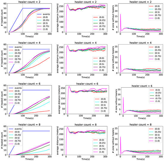 At runtime, the program identifies agent roles (healer, explorer, stationary) according to the local behaviour sensed. There are 80 mobile nodes (40 explorers and 40 healers), 20 stations and 100 animals. Only healers can rescue animals. The animals are divided into five independent groups. Each group moves according to the random waypoint logic [55]. An animal in danger needs a variable number of healers near to him to be rescued. The program follows the Self-organising Coordination Regions (SCR) pattern [44]: