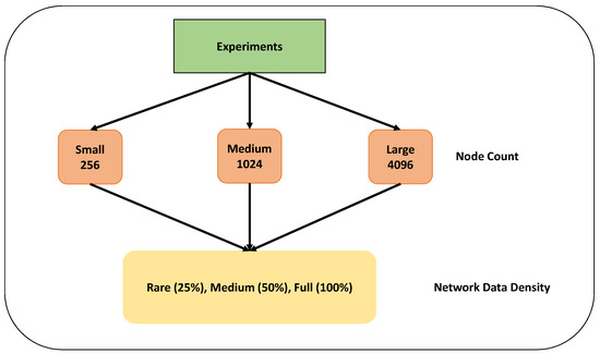 This simulation aimed to run the data collection experiments on a field of km km. As Figure 3 shows, there are two parameters to simulate experiments: sensory device count and data density. That way, varying numbers of sensory devices, 256, 1024 and 4096, were randomly distributed throughout the network. This allowed us to observe and evaluate the route planning approach behaviour, scalability and performance if the node count changes.