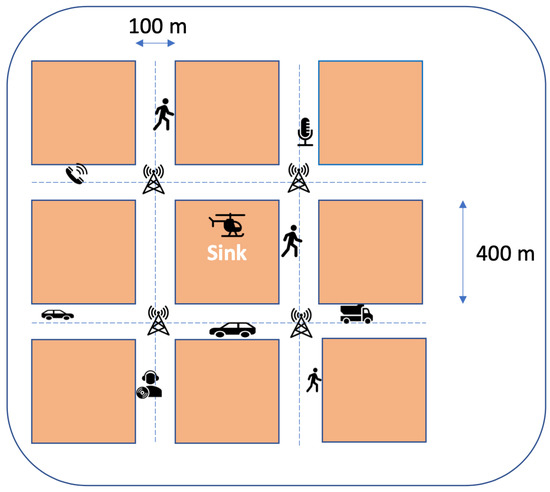 As Figure 4 shows, the data collection map was simulated according to a Manhattan model. The blocks (11 × 11) had a size of 400 m. The roads were two-lane with 100 m width. LDSs were localised at the middle of junctions (500 m distance between each pair) and formed a grid communication infrastructure. Each one was assigned by an ID containing grid row and column number. The sink was located in the centre (block) of the grid.