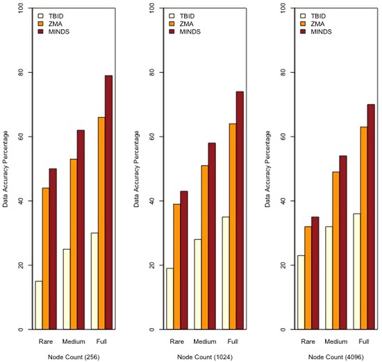 TBID underperforms compared to MINDS and ZMA for DAR. This is because of TBID establishing a tree structure according to an address-centric manner. This utilises no data-centric feature to establish the routes. For this, the tree is formed with a number of LDSs which might have no data records matching the query. This results in MA migration to a hole which has no meaningful data records to report. Hence, DAR is reduced especially when data density is low.