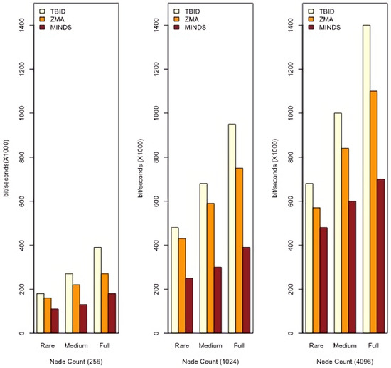 According to Figure 8, MINDS reduces TTR as compared with the benchmarks. This is because of utilising NDN routing, which avoids transmitting redundant and/or meaningless messages. NDN routing utilises a data-centric technique which only allows forwarding network traffic if it matches a routing forwarding strategy. That way, LDSs avoid forwarding/broadcasting the network traffic blindly. Moreover, this utilises a clustering technique which limits the network communication to intra-cluster messages. This means that network traffic is reduced, as only a few LDSs participate in route planning. Indeed, CHs are the only nodes which forward the route planning messages, and CMs do not individually participate in route planning. The Hamming distance technique is a lightweight clustering technique which utilises a reduced number of network messages to form the clusters. It is performed in a distributed manner and avoids widely transmitting network messages for clustering.