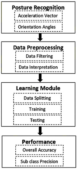 The system architecture of this approach consists of four primary modules—posture recognition, data collection and data preprocessing, learning module, and performance module. Next, we outline each of these modules. The system architecture is shown in Figure 1. The posture recognition module is associated with the functionality to detect the user’s posture at each time instant by interpreting the motion and movement-related data during different activities. One methodology for developing such a posture recognition approach is by analysis of the accelerometer data (obtained from a wearable sensor) in the X-, Y-, and Z-directions during different activities at different time instants [45].