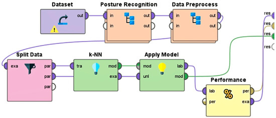 As we used RapidMiner to develop this proposed methodology, we will define two terminologies specific to RapidMiner here in a broad manner. They are “process” and “operator”. In RapidMiner, an “operator” refers to one of the multiple building blocks of an application associated with specific functionalities that can be changed or modified either statically or dynamically, both by the user and by the application based on the specific need. In RapidMiner, certain operators are already developed in the software tool, which can be customized or updated. The tool also allows for the development of new operators based on any specific need. A continuous, logical, and operational collection of “operators” linearly or hierarchically representing a working application with one or more output characteristics is referred to as a “process”. The RapidMiner process that represents this methodology is shown in Figure 2. The “dataset” operator was used to import the given datasets into the RapidMiner platform. Then we developed the “posture recognition” operator as per the characteristics of the posture recognition module of the system architecture, shown in Figure 1. This posture recognition operator was connected to the “data preprocess” operator, which was developed to perform the necessary data filtering and data preprocessing as outlined above. After that, the built-in “split data” operator was used to split the data into the training set and test set, where 80% of the data was used to train and 20% of the data was used to test the k-NN-based multilabel classification model. This k-NN classifier was implemented using the built-in “k-NN” operator in RapidMiner. The following is the pseudocode of the k-NN learning method: