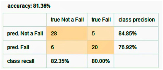 Figure 3 shows the confusion matrix that shows the performance accuracy of the RapidMiner process shown in Figure 2 when we imported the first dataset [50] using the dataset operator. As shown in Figure 3, this k-NN-based multilabel machine learning approach for detecting falls and fall-related motions achieved an overall performance accuracy of 98.32%. It could detect the motions that correspond to falling, lying, being on all fours, and standing up from lying, with respective class precision values of 87.72%, 98.42%, 96.09%, and 96.71%. Here, “lying” refers to the person lying on the ground after having experienced a fall. It could also detect “other activities” with an accuracy of 99.09%. “Other activities” comprises all activities other than falls or fall-related motions that were present in this dataset. Figure 4 shows the confusion matrix that shows the performance accuracy of the RapidMiner process shown in Figure 2 when we imported the second dataset [51] using the dataset operator. It achieved an overall performance accuracy of 81.36%, with the class precision values for falls and other activities being 76.92% and 84.85%, respectively.
