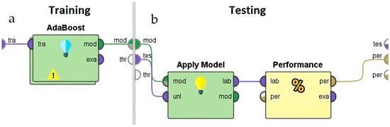 To evaluate the characteristics of the learning method, we used the built-in “performance” operator in RapidMiner. This operator can be used to calculate the overall accuracy and the individual class precision values of a learning method, which is represented in the form of a confusion matrix. The results of the same are further discussed in Section 3.2. We developed two different processes in RapidMiner corresponding to the two different datasets [50,51]. The only difference in these two processes was that the dataset operator consisted of a different dataset each time.