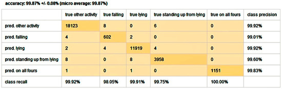 As shown in Figure 7, the use of the k-folds cross-validation approach with the AdaBoost algorithm boosted the performance accuracy of the k-NN-based learning approach considerably. The improved overall performance accuracy of this approach was now 99.87%, with the subclass precision values for the activities of falling, lying, standing up from lying, being on all fours, and other activities being 99.01%, 99.92%, 99.60%, 99.83%, and 99.92%, respectively. The confusion matrix that outlined the performance accuracy of our approach when tested on the second dataset [51] is presented in tabular form in Figure 8. As can be seen from Figure 8, the use of the k-folds cross-validation approach with the AdaBoost algorithm boosted the performance accuracy of the k-NN based learning approach considerably yet again. The improved overall performance accuracy of this approach was now 99.66%, with the subclass precision values for falls and other activities being 100% and 99.42%, respectively.
