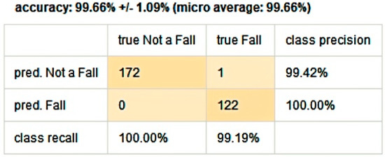 Confusion matrix representing the overall performance accuracy as well as the subclass precision values for the different activities, including falls, of the RapidMiner process shown in Figure 5 when the second dataset [51] was used.
