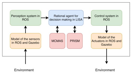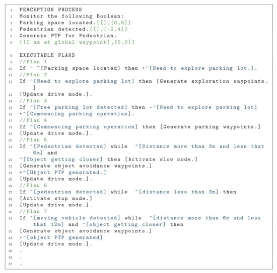 Most autonomous robotic agents use logic-based inference to keep themselves safe and within permitted behavior by providing the basis of reasoning for a robot’s behavior []. Given a set of rules, it is essential that the robot can establish the consistency between its rules, its perception-based beliefs, its planned actions, and their consequences. In this paper, we are concerned with the high-level software components responsible for decisions in an AV capable of navigation, obstacle detection and avoidance, and autonomous parking. These logic-based decisions can either be implemented through a rational agent [,,,,,] or through fuzzy logic [,,] depending on the level of performance guarantee required.