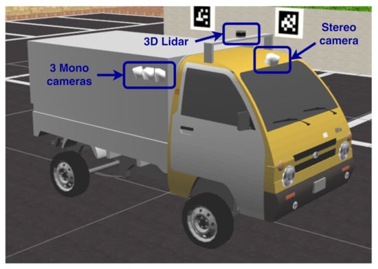 Modern vision-based detection techniques work by extracting image features to segment regions of interest (ROI) then detect different objects within those regions. In particular, the detection of people and vehicles has made significant progress in the autonomous and assisted driving areas [,]. Radar is a robust and invaluable information source for perceptual tasks; however, the spatial resolution of radar is typically poor compared to camera and LiDAR. Thus, much recent perception research is focused toward cameras and LiDAR. We have designed a parking lot scenario in ROS and Gazebo to explain the use of different sensors as shown in Figure 5.