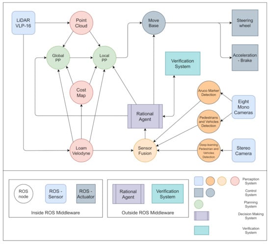 Our AV system showing the main nodes designed in ROS for perception, planning, and control (secondary and supporting nodes are not shown here); RA was designed in sEnglish [,], whereas the verification system was designed in MCMAS and PRISM verification tools.