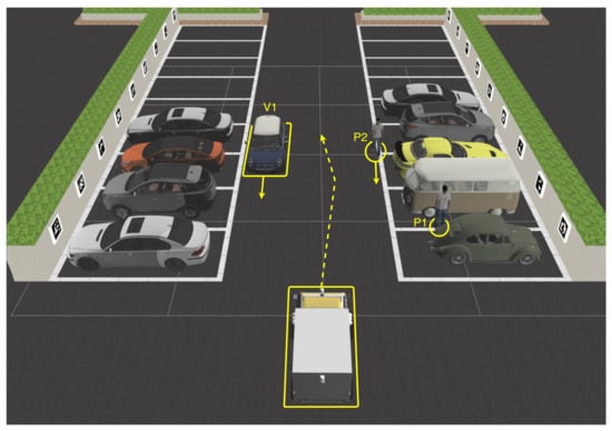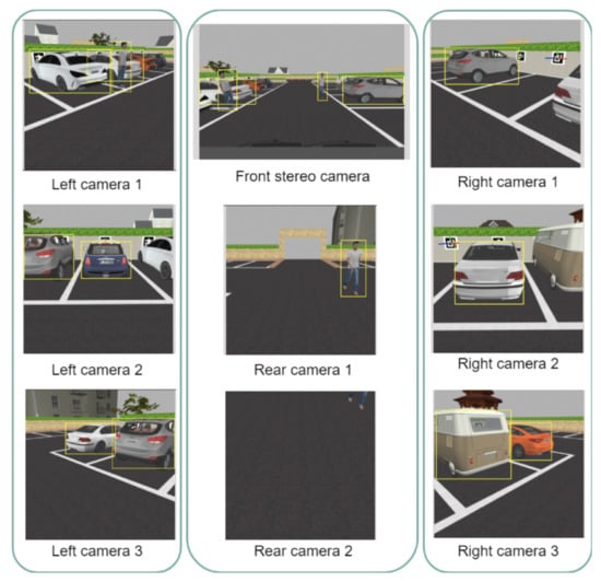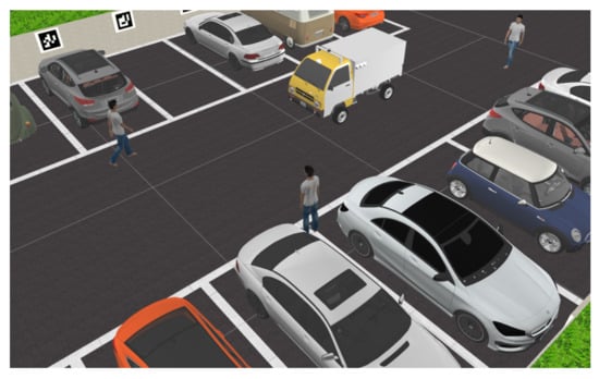 In this simulation-based system, we tried to mimic our approach for the experimental AV system, where we used a Velodyne VLP-16 LiDAR, one ZED stereo camera, and eight Raspberry Pi 3 model B mono-cameras (8 megapixels each), The properties for these sensors are mentioned in Table 1. The LiDAR is connected directly to ROS for point cloud data processing. The front-facing stereo camera is connected to the Jetson TX2 running YOLOv3 [] deep-learning-based object detection. The mono-cameras use the processing power of their host Raspberry Pi system for aggregated channel features (ACFs) object detector of pedestrians and vehicles []. Those mono-cameras, along with the stereo-camera, cover a 360 FOV. The camera system has also been equipped with a method for fiducial-follow that uses Aruco markers to detect the location and orientation of free parking slots, as shown in Figure 6 (right camera one and two). Along with the occupancy grid data generated by the LiDAR, the AV is capable of detecting free parking spaces simply and efficiently. Figure 6 also shows the detection of vehicles and pedestrians, which is a vital process for normal operation of the AV.