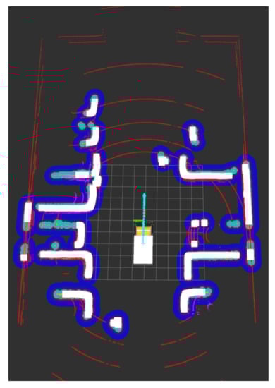 Figure 7 shows the map built for the AV current path in the parking lot shown in Figure 5. The sides of the objects that are facing the LiDAR are shown on the map with white lines. We added another layer of protection using a cost map function, which helps the AV to keep an extra safe distance from any object within a specific inflation distance where this could be set according to the environment type; it is represented on the map in Figure 7 with the blue lines surrounding the white lines. Finally, the data for the detected objects and their locations are sent to the RA for further processing.