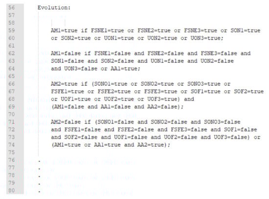 Pre-programmed rules are used to set the relationship between the perception predicates (beliefs) and the available actions. When this combination is verified by MCMAS during design time, then there will be no space for an unfeasible, repeated, or misleading action in the agent’s actions list. The advantages of this operation are clearer when we deal with general real-life driving scenarios that could have a large number of predicates; in this case, the manual checking of those predicates would be unfeasible.