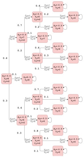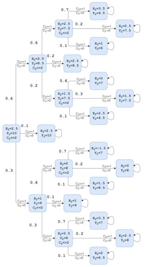 In the literature, similar approaches have been made by reducing decisions to a limited set of options and conducting evaluations with an individual set of policy assignments for each option. In general, the probabilistic representation of system models can be divided into four main types: discrete-time Markov chain (DTMC), continuous-time Markov chain (CTMC), Markov decision process (MDP), and probabilistic timed automata (PTA). A typical implementation of learning different driving styles in a highway simulation showed the potential of the probabilistic approach represented by MDP [,]. In ref. [], the authors showed an enhanced version of the algorithm and its performance by generating human-like trajectories in parking lots, with only a few demonstrations required during learning. A partially observable MDP (POMDP), an extension of MDP, has been used in refs. [,] to integrate the road context and the motion intention of another vehicle in an urban road scenario.