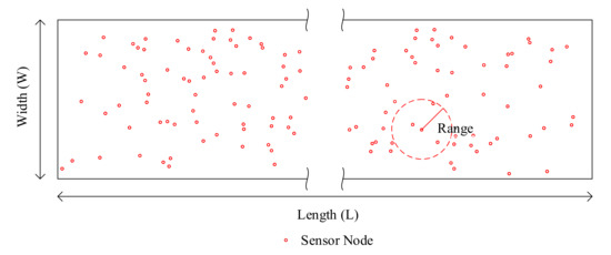 Illustration of a thick linear sensor network. Sample parameter values: L = 10,000 m, W = 500 m, and range = 100 m.